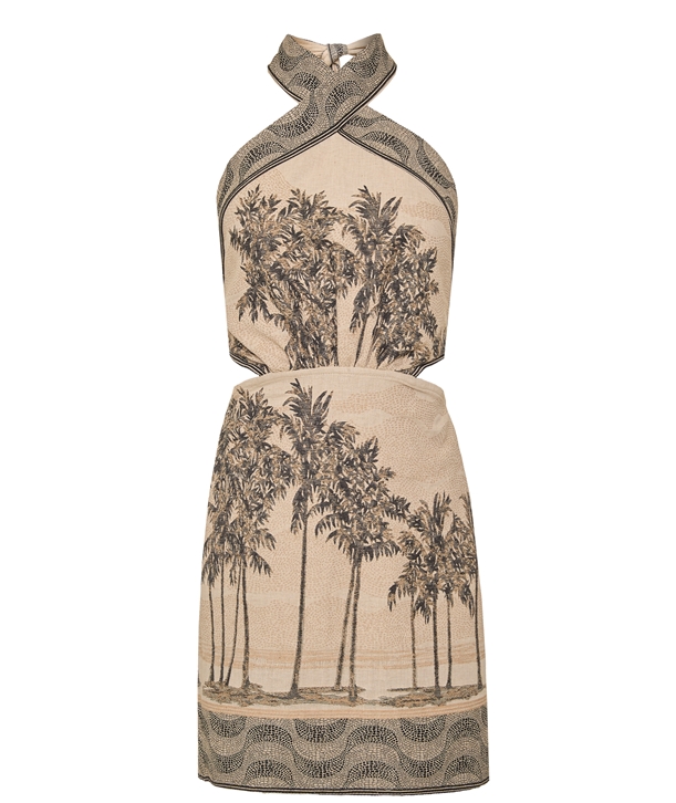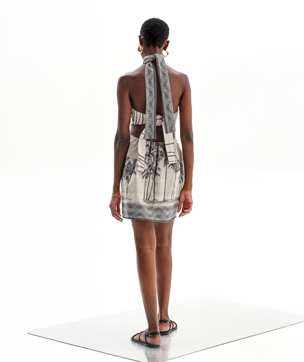 Μπεζ μαύρο βαμβακερό cut out μίνι halter neck φόρεμα με ζακάρ μοτίβο.