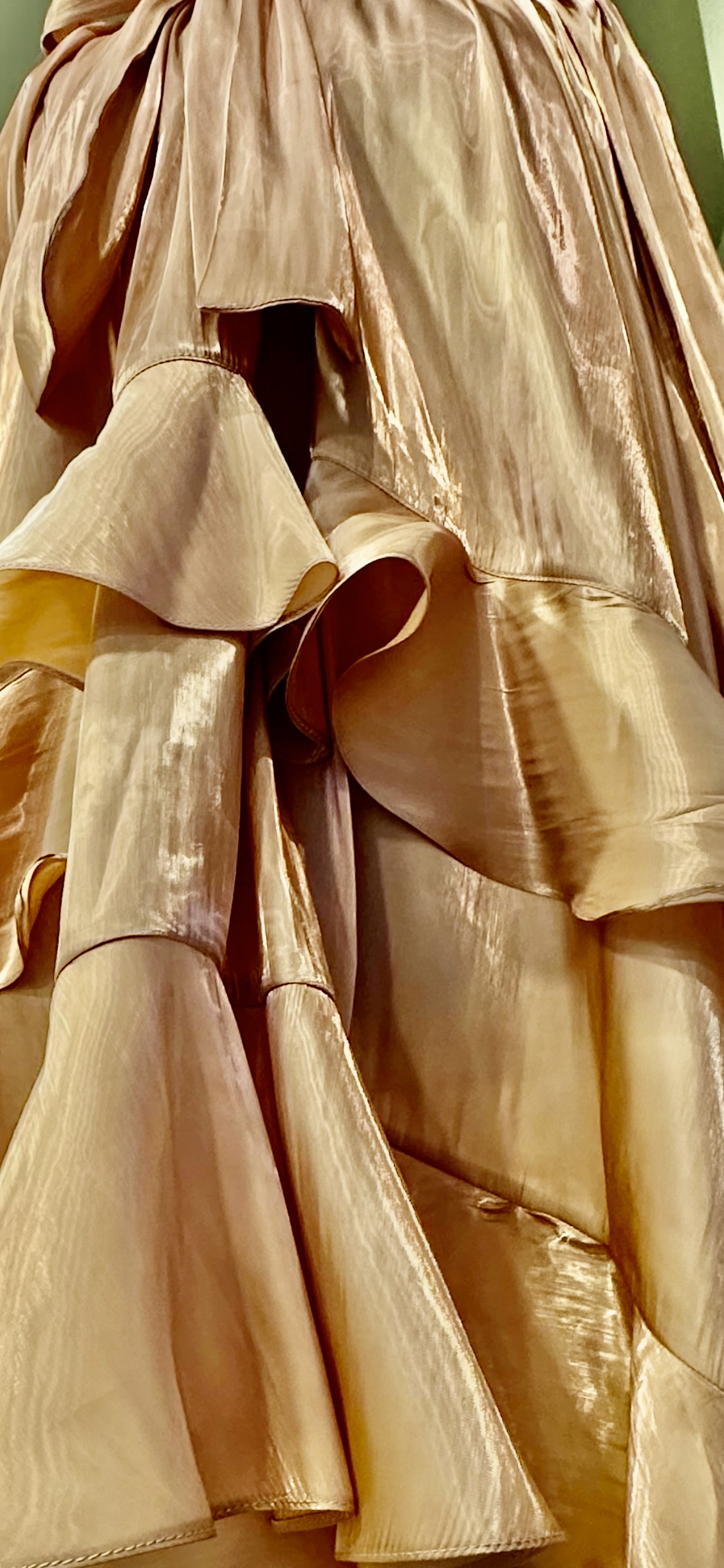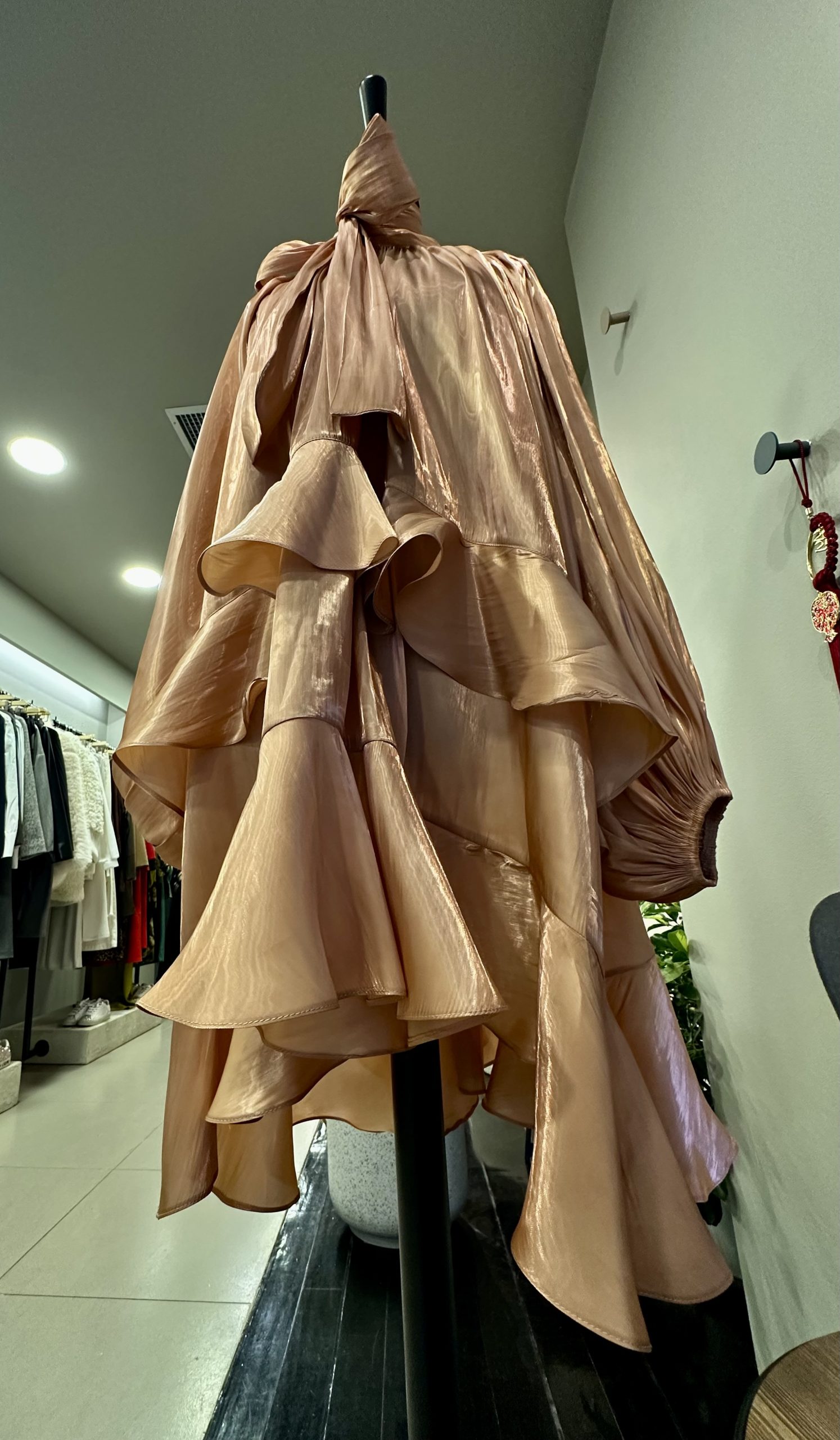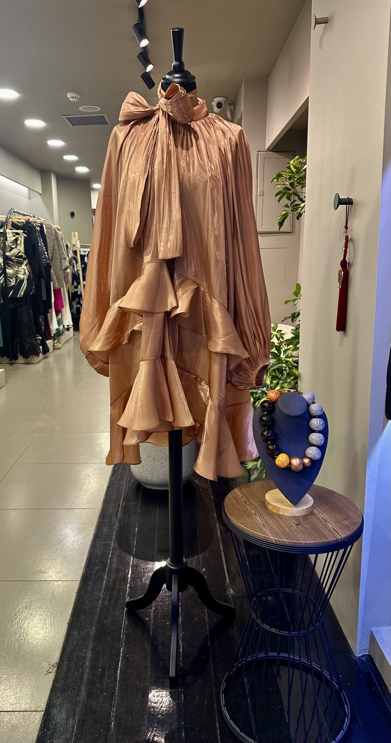 Φόρεμα με βολάν σε σομόν χρώμα και φιόγκο στον λαιμό.